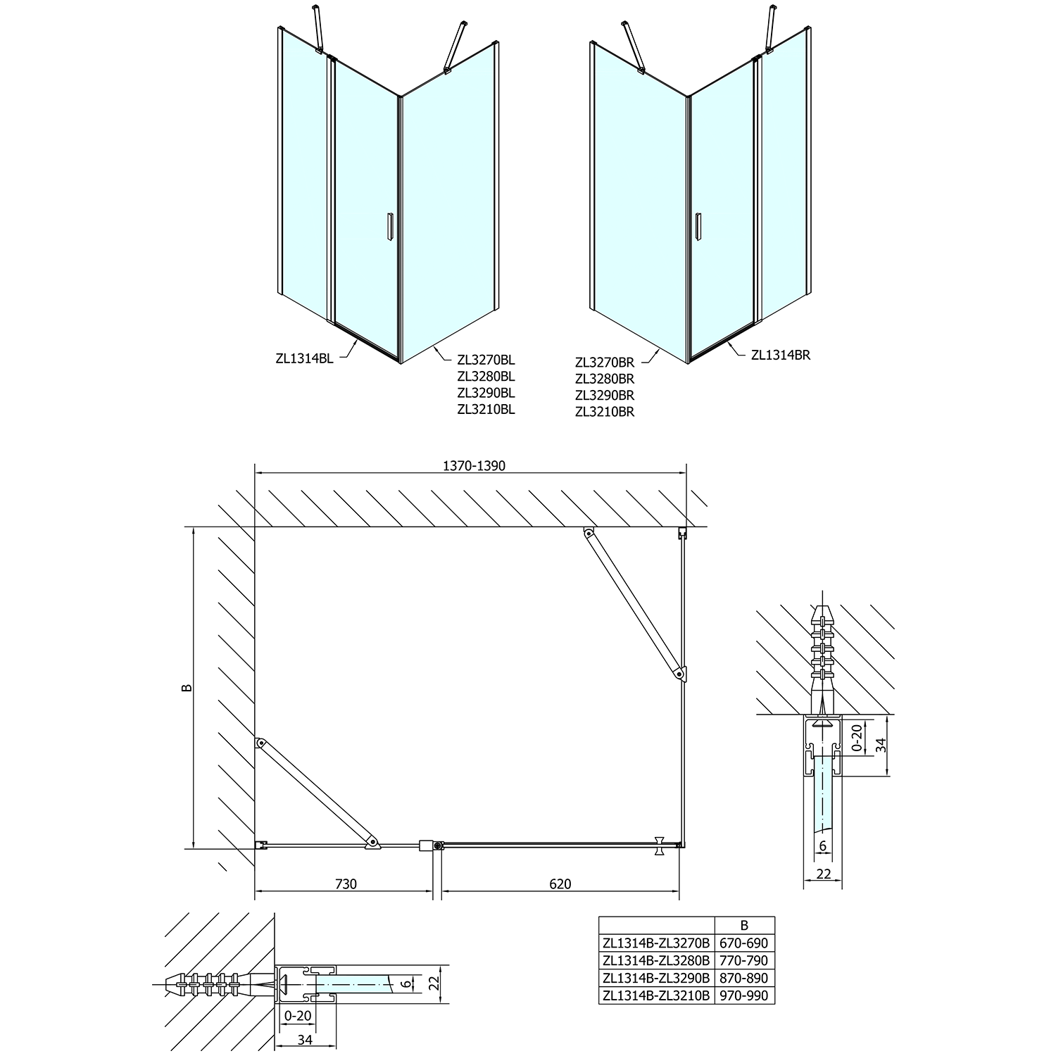ZL1314BZL3210B POLYSAN ZOOM LINE zuhanyajtó és oldalfal, jobbos/balos, 1400x1000mm, transzparent, fekete