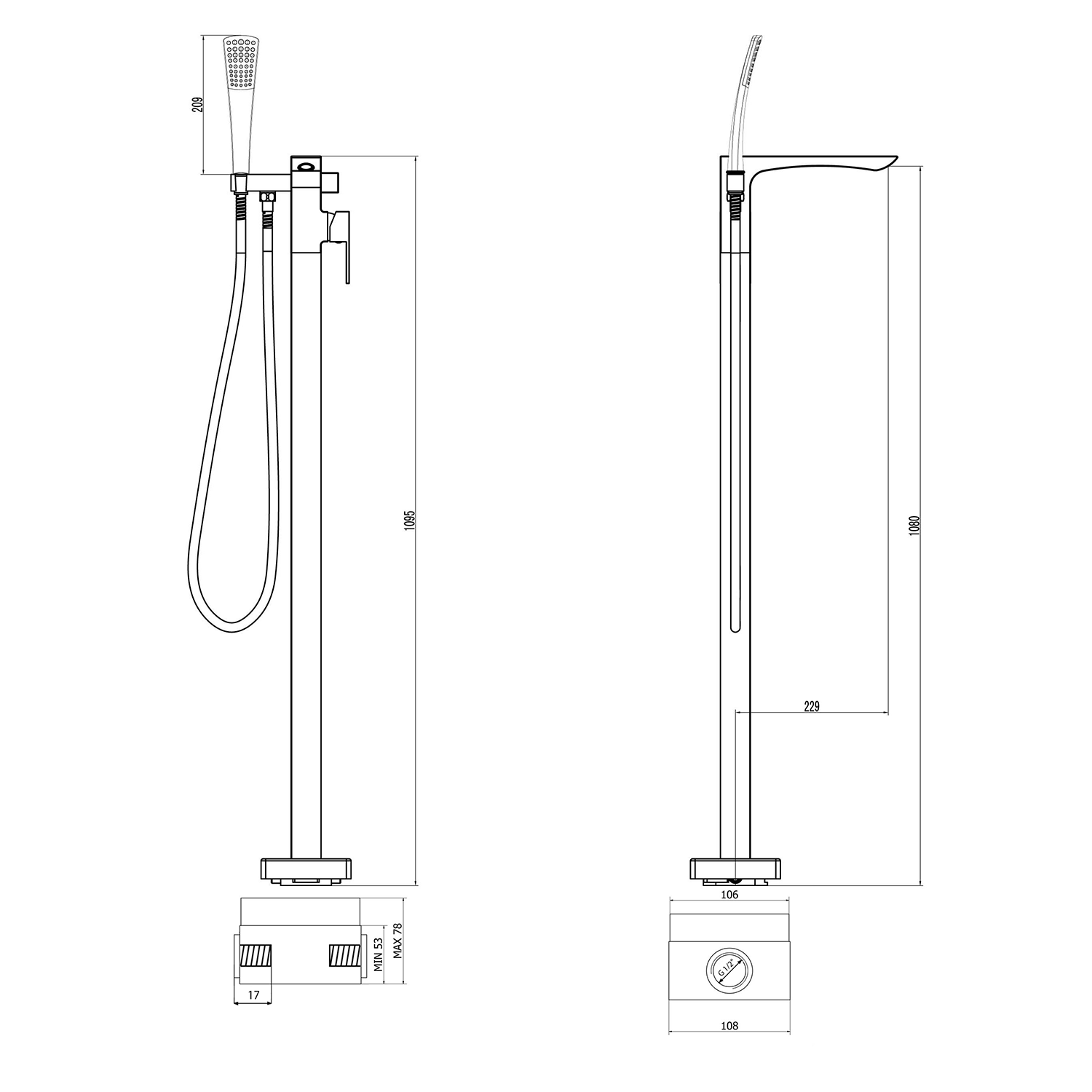 1101-21B GINKO térben álló kádtöltő csaptelep, zuhanyszettel, alaptesttel, matt fekete