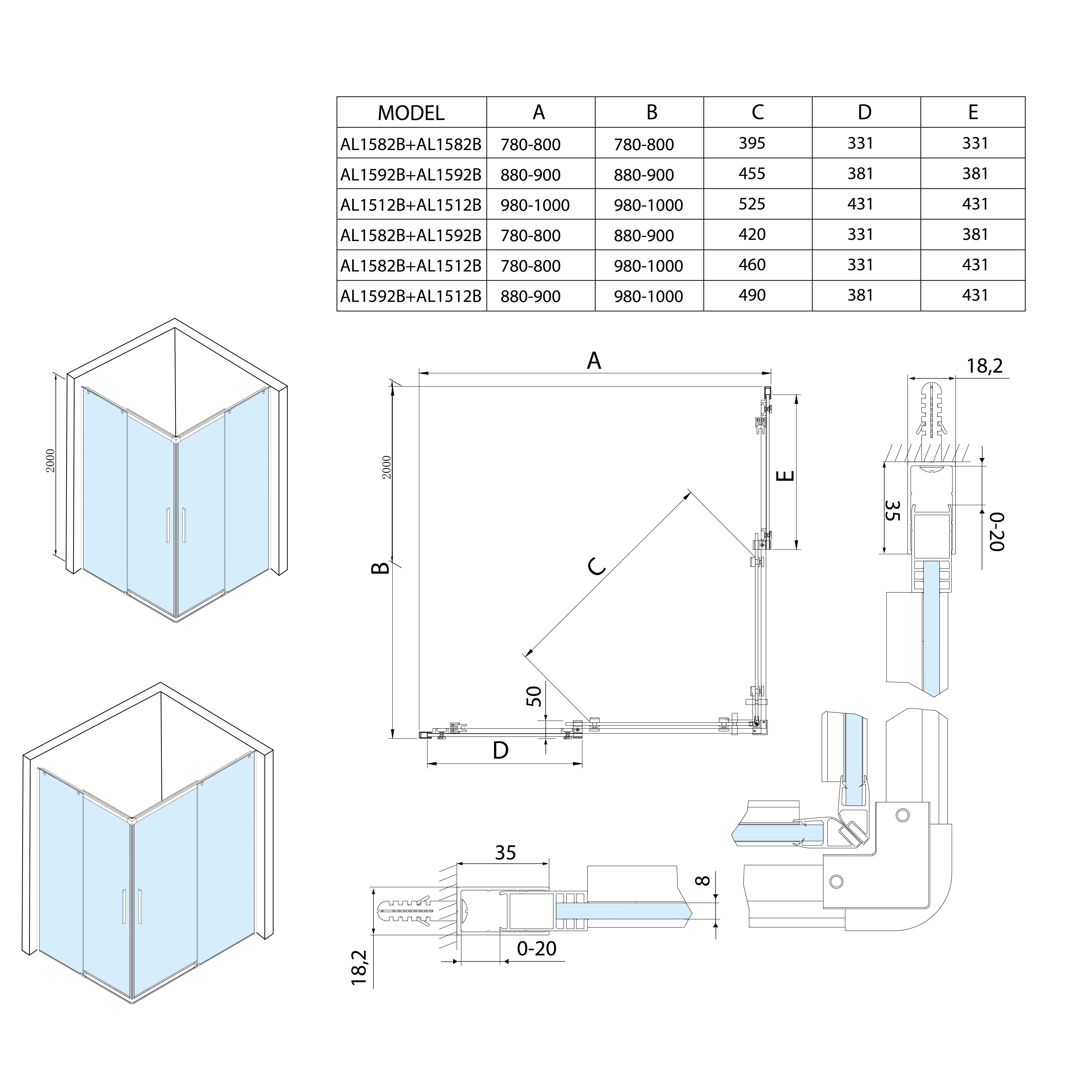 AL1510CAL1580C ALTIS LINE szögletes zuhanykabin, 1000x800mm, jobbos/balos, sarokbelépős