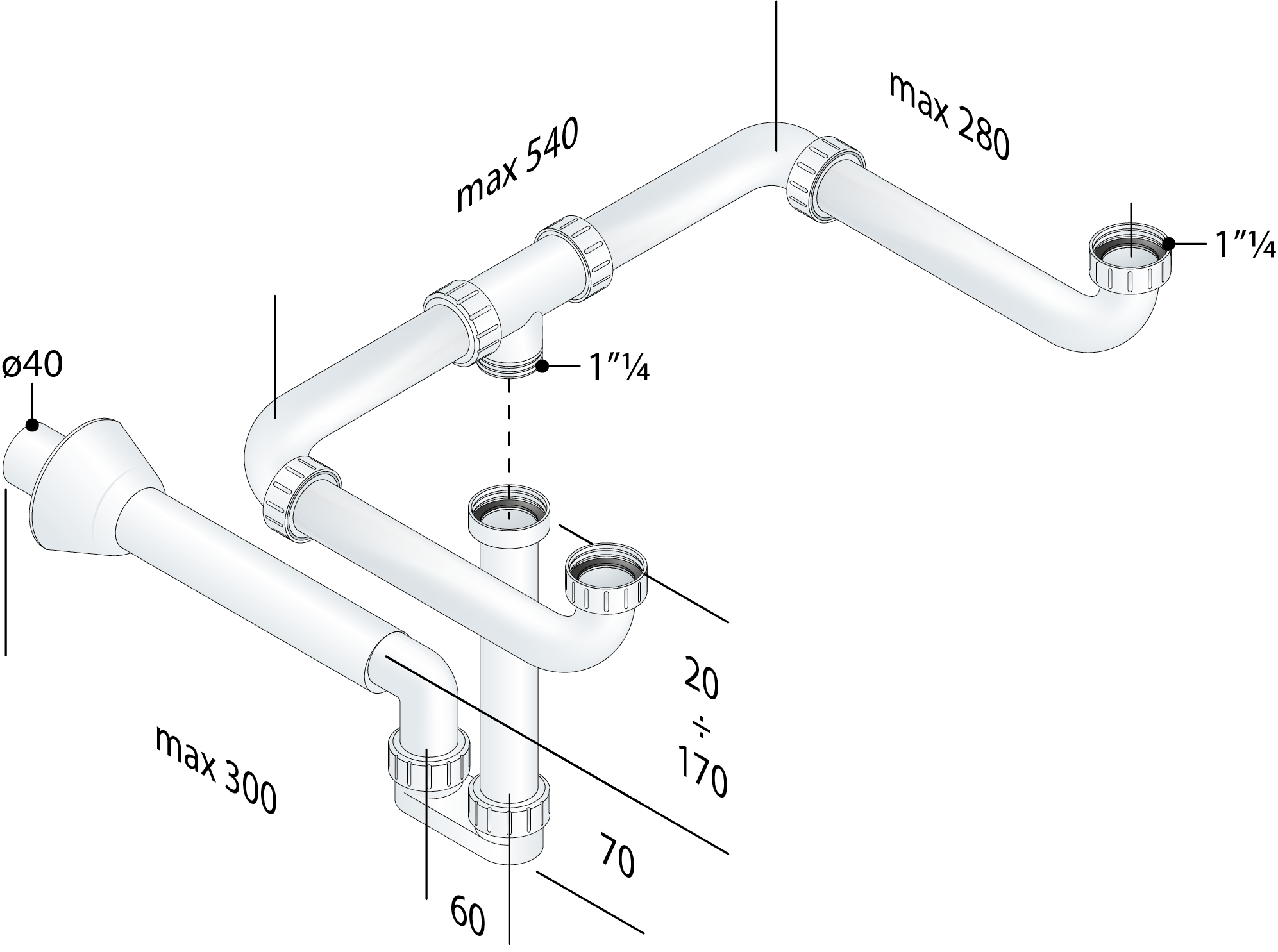 This is a system where the pipe under the sink takes the water to the wall before it drains downwards vertically. This solution is suitable, for example, for bathroom furniture where the siphon does not prevent the use of a shelf/drawer, for washbasins with a shelf or washbasins for the physically handicapped.