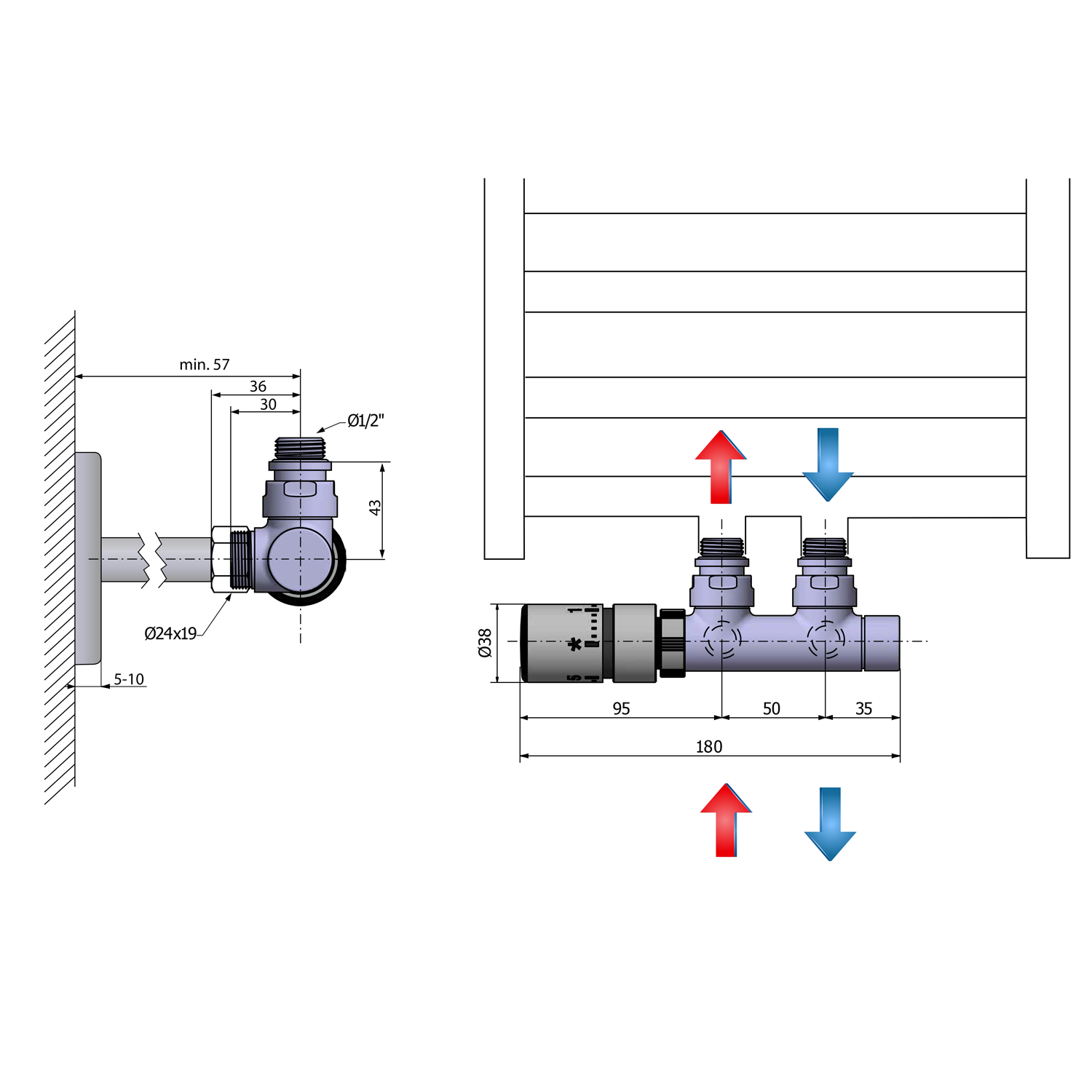 Manual valve: Temperature control is carried out manually. The hot water supply can be connected to the left/right side of the valve without limitation.A valve with a thermostatic head: the integrated thermostat maintains the temperature inside the towel rail. The thermostatic head must be located at the hot water inlet (except MONO ONE).