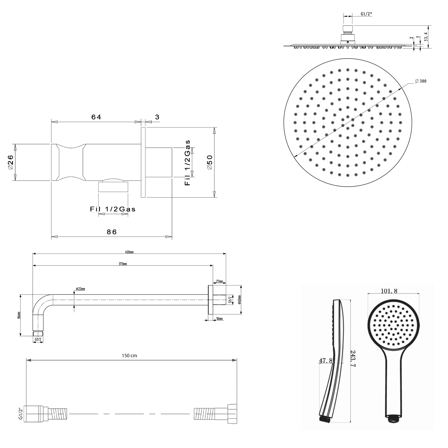 KA11/15 KAI fali zuhanycsaptelep, zuhanyszett nélkül, matt fekete
