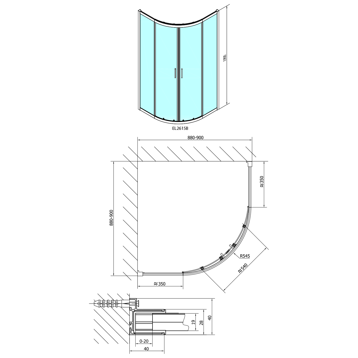 EL2615B POLYSAN EASY LINE BLACK íves zuhanykabin, 900x900mm, matt fekete profil/transzparent üveg