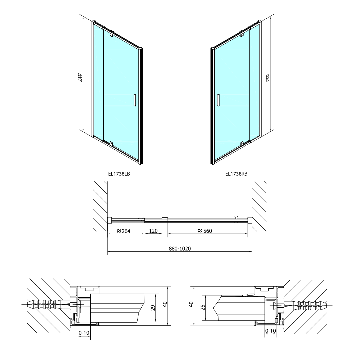 EL1738B POLYSAN EASY LINE BLACK nyílóajtó fix résszel, 880-1020mm, matt fekete profil/BRICK üveg