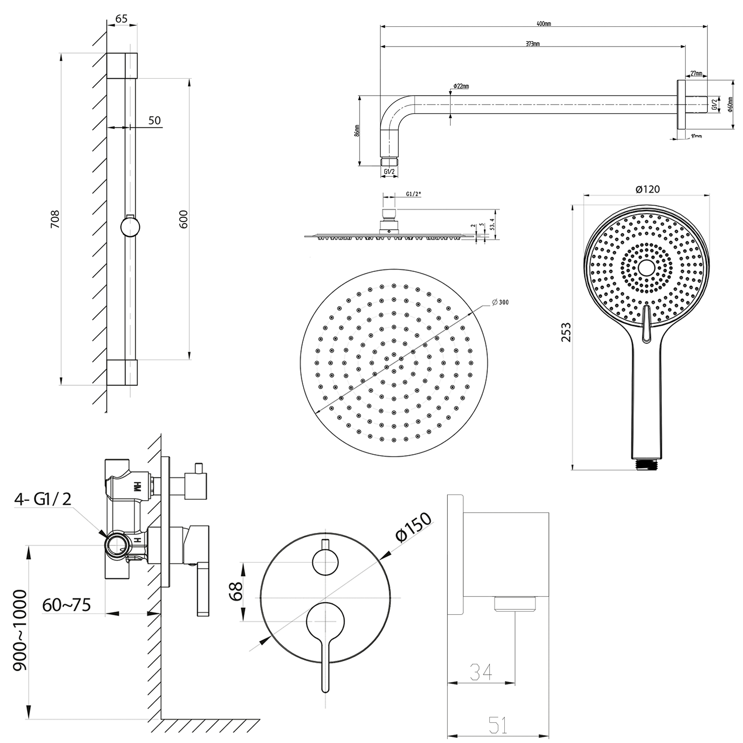 AF042-02 ICONIC falbasüllyesztett csaptelep, zuhanyszettel, zuhanyrúddal, fejzuhannyal, 2-irányú, króm
