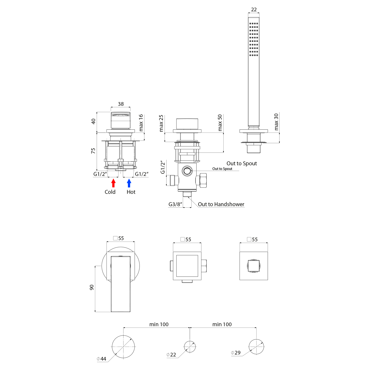 DM292BL DIMY fali termosztátos kádtöltő csaptelep, kaszkád kiömlővel, fekete