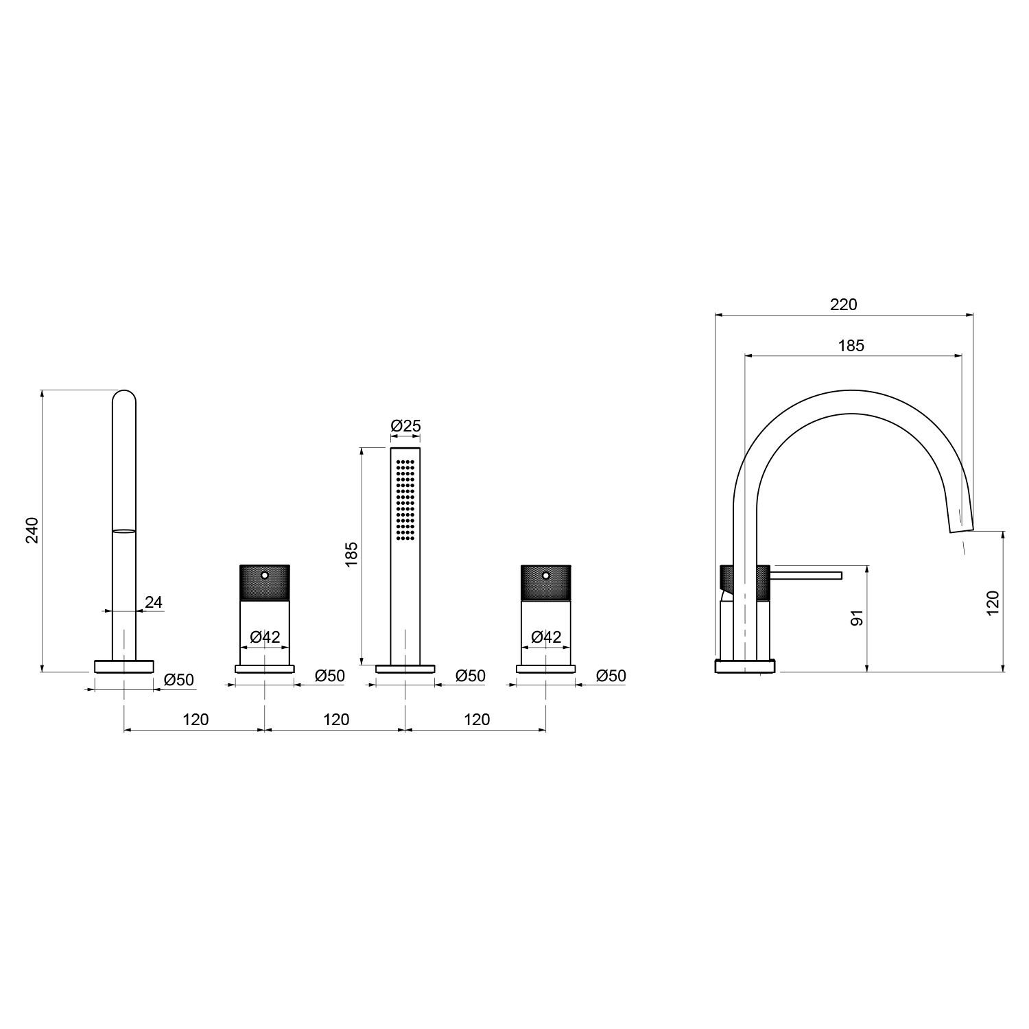 UT052VB ULTRASAN kádperemre építhető csaptelep, kifolyócsővel és kézizuhannyal, matt fekete