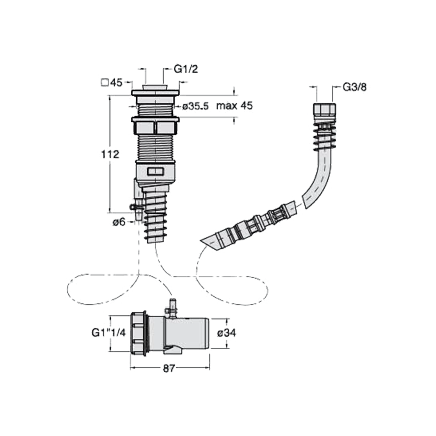 Hose extension system for mounting on the bath edge. The hand shower is returned by a return spring and the hose is dried at the same time. In addition, this system prevents water from flowing under the bathtub by means of a drain.